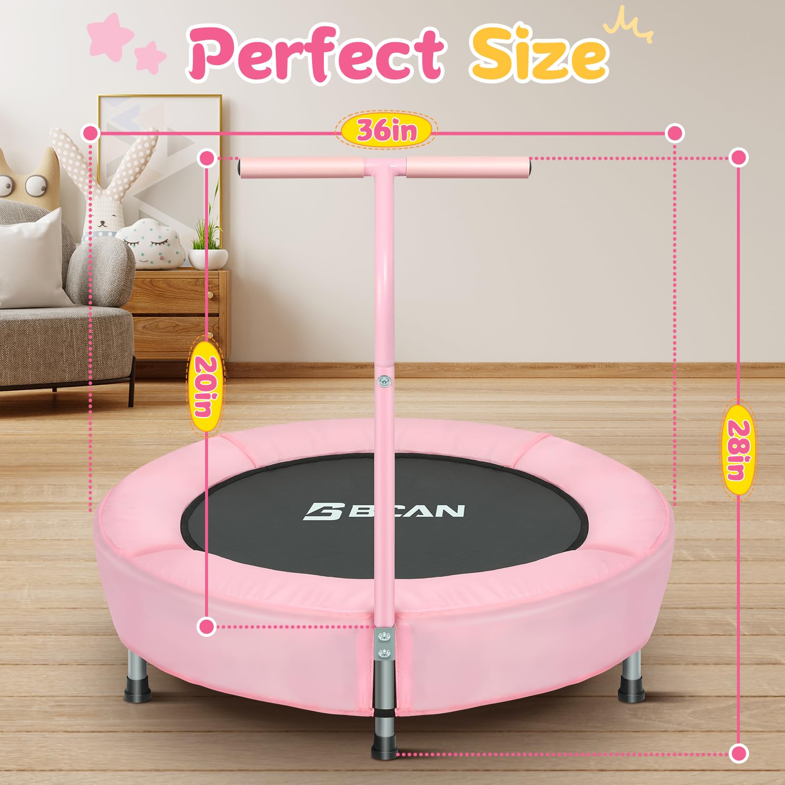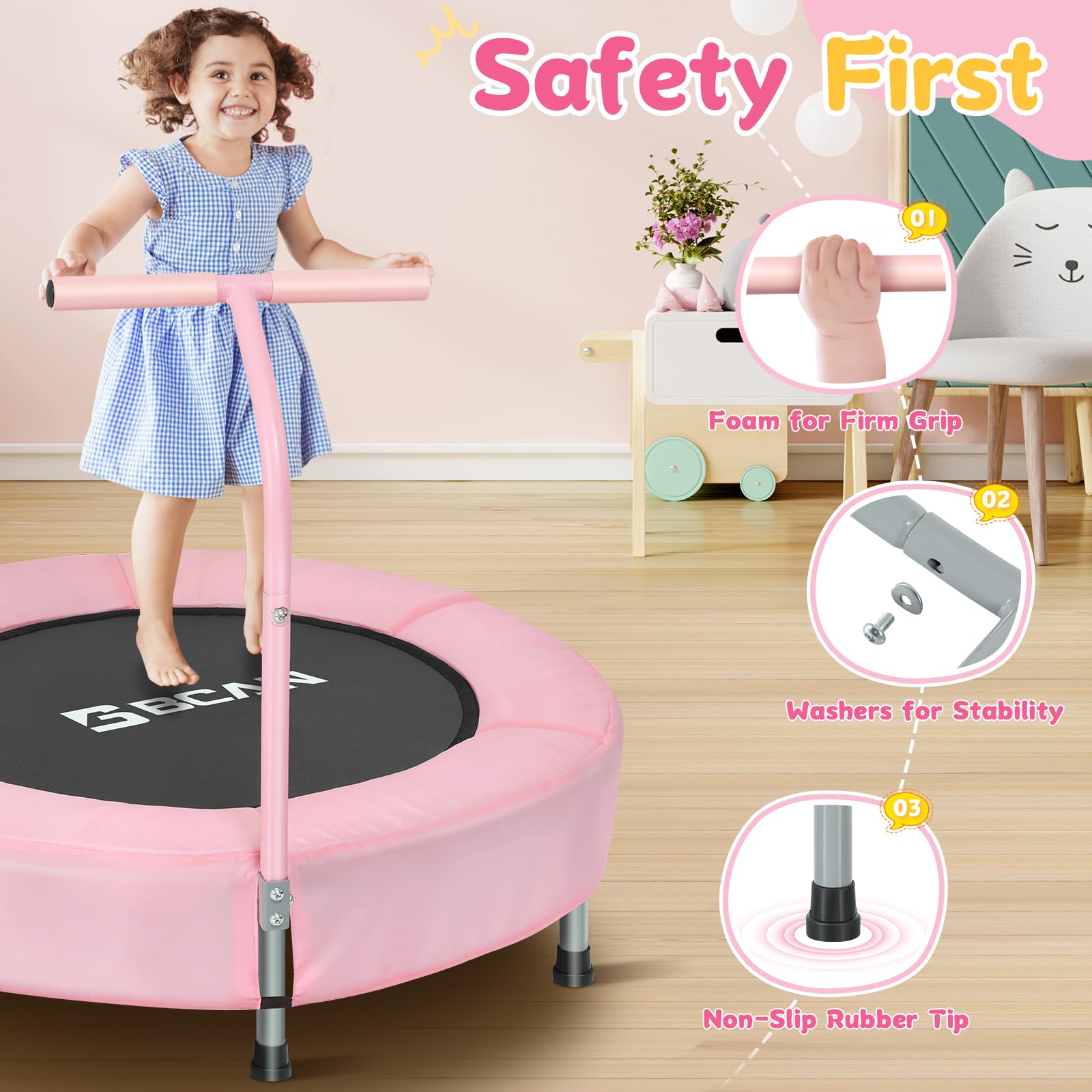 - Superior Safety: Our toddler trampoline prioritizes safety with its foam handlebar, non-slip rubber tips and stability-enhancing washers to ensure a worry-free bouncing experience for your child